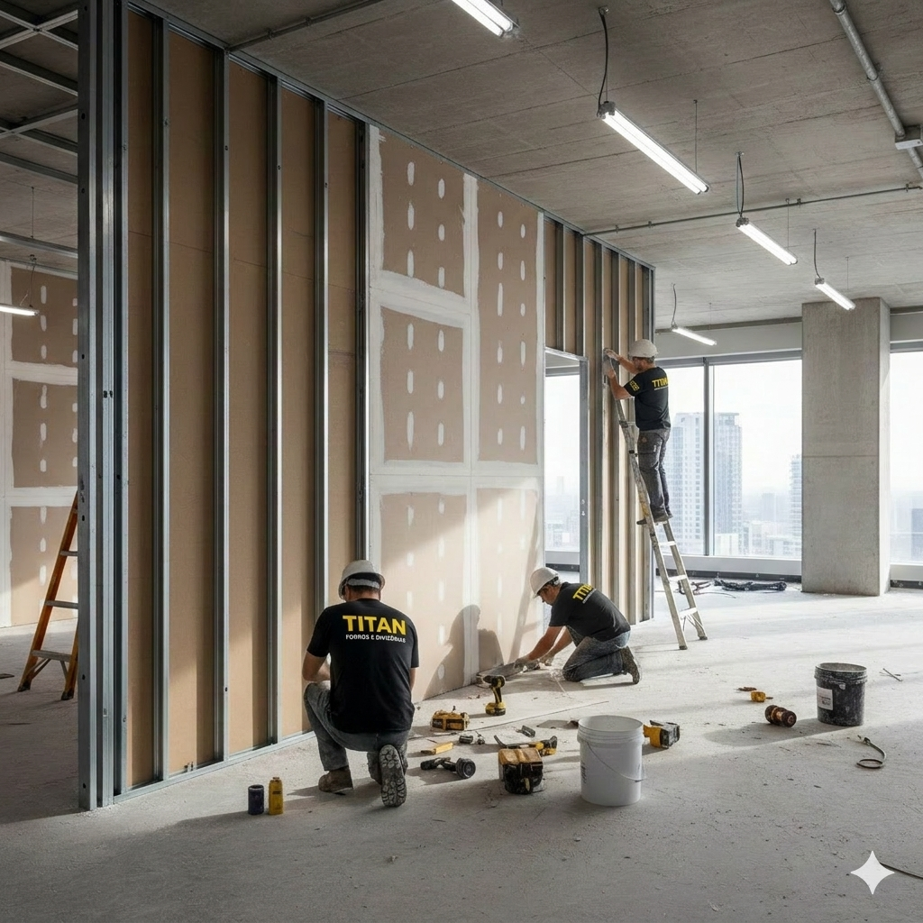 Na TITAN, entregamos a estrutura que sua obra precisa com a versatilidade que o seu projeto exige. Somos especialistas na instalação técnica de Drywall e Forros, oferecendo a conveniência de contratação integrada de pintura profissional, garantindo superficies lisas e prontas para uso.